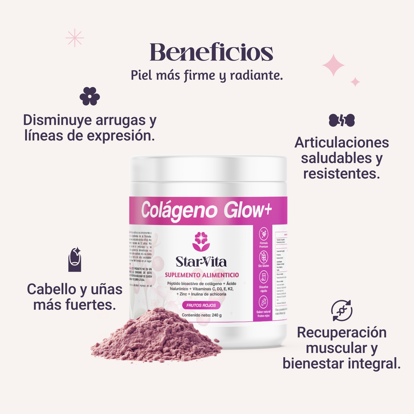 Formula Premium Colágeno Glow+ está formulado con colágeno hidrolizado de alta calidad, desarrollado en Francia y elaborado en México. Su función es apoyar la elasticidad y firmeza de la piel, además de contribuir a una apariencia más fuerte y saludable de cabello y uñas.