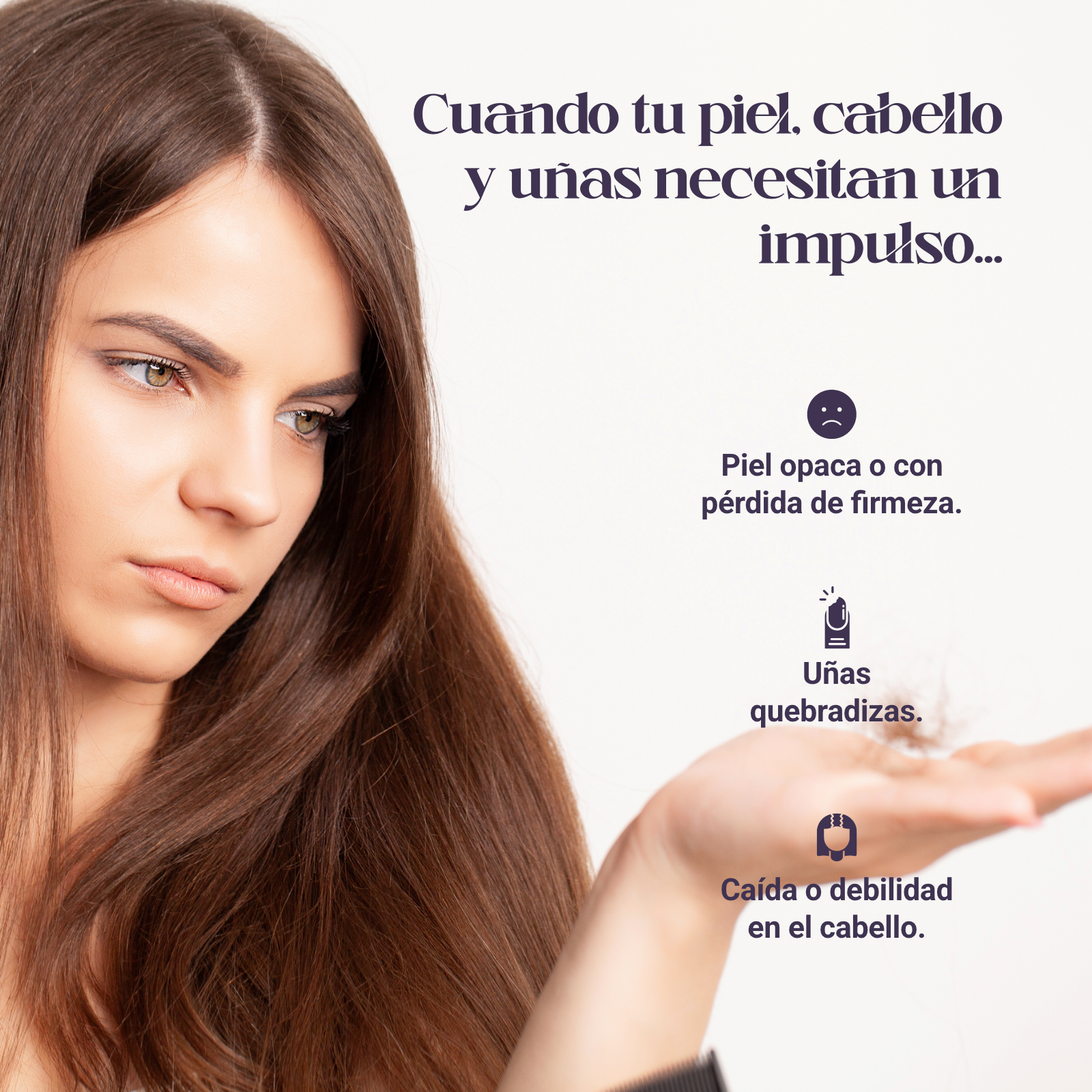 El colágeno es una proteína estructural esencial que forma parte de la piel, cabello y uñas. A partir de los 25 años, su producción comienza a disminuir progresivamente.