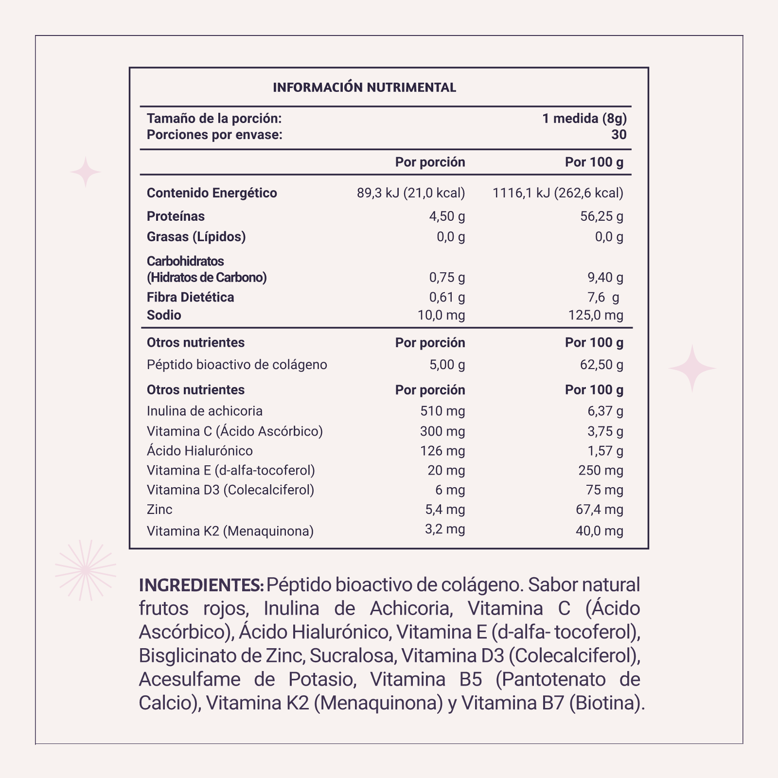 Suplemento alimenticio con colágeno hidrolizado, vitaminas y minerales. No sustituye una alimentación equilibrada ni hábitos saludables.